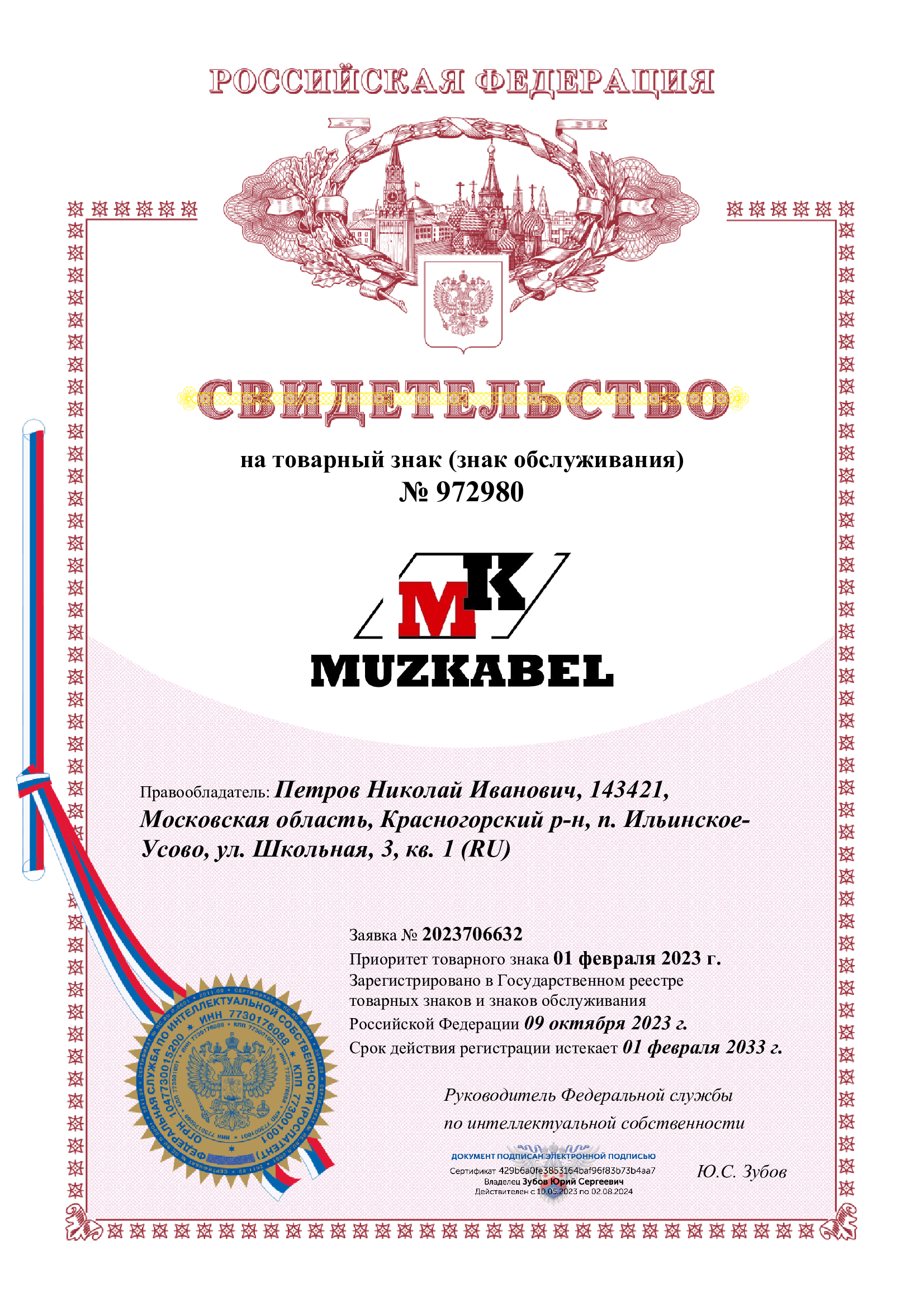 Свидетельство о государственной регистрации бренда "MUZKABEL"